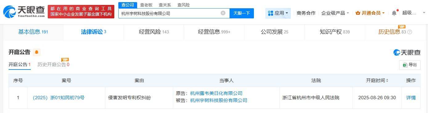 天眼查天眼风险信息显示,近日,杭州宇树科技股份有限公司新增1条开庭公告正规股票配资app,原告为杭州露韦美日化有限公司,案由为侵害发明专利权纠纷,该案将于8月26日在杭州市中级人民法院开庭审理。
