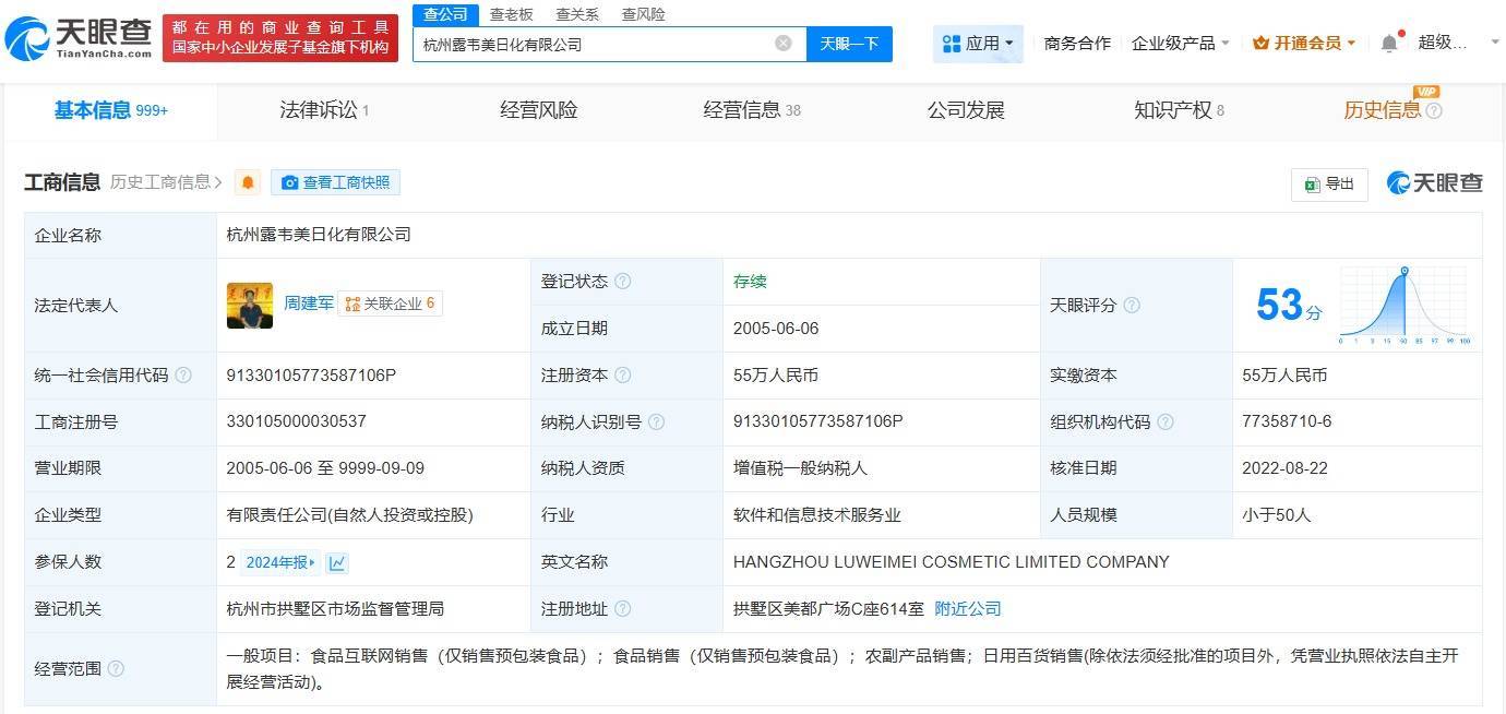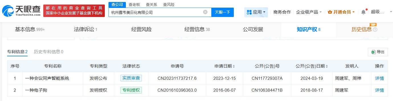 工商信息显示,杭州露韦美日化有限公司成立于2005年6月,法定代表人为周建军,注册资本55万人民币,经营范围包括食品互联网销售、农副产品销售、日用百货销售等,由周建军、徐燕共同持股。知识产权信息显示,该公司已申请“一种电子狗”和“一种会议同声智能系统”专利,其中“一种电子狗”专利已获授权。