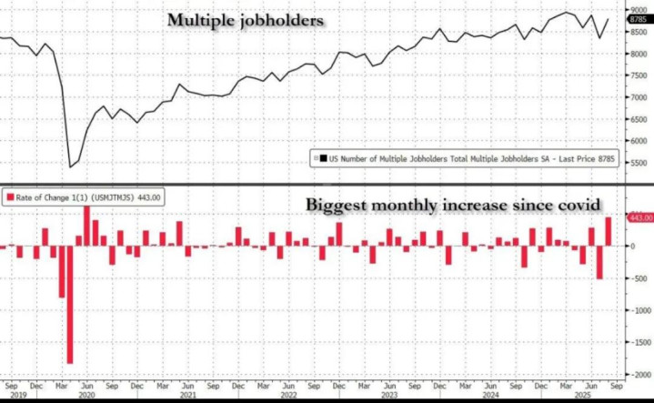拥有多份工作的人数(即多重职业持有者)在8月意外激增超过44.3万人,达到878.5万,这是自新冠疫情以来的最大单月增幅。