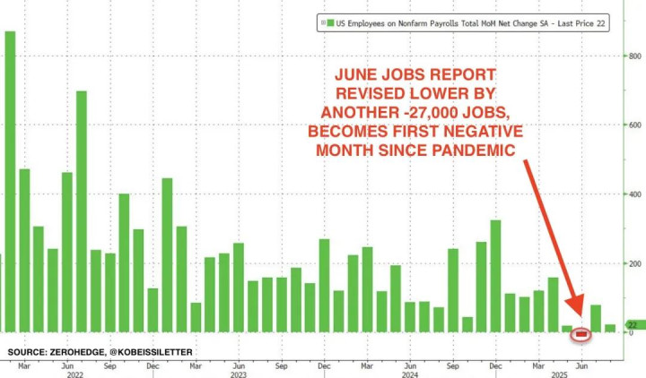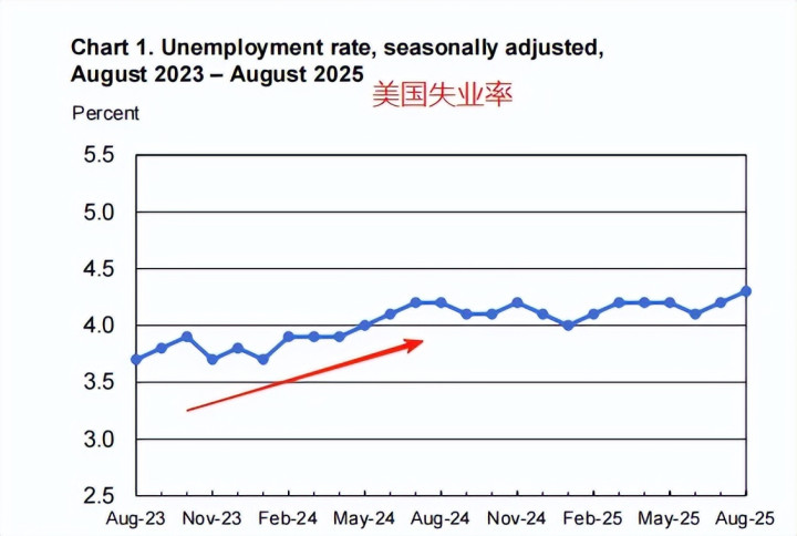 与此同时,6月和7月非农就业人数合计下修2.1万人(5/6月份的数据7月份才刚刚大幅下修28万,劳工局局长因此被特朗普免职),失业率升至2021年以来新高。计入本次报告的修正后,过去三个月的月均新增就业人数仅为2.9万人。