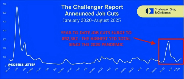挑战者数据还显示,2025年8月裁员人数8.8万人,为2020年8月以来的最高值。2025年以来,裁员人数达到89.2万,同比2024年增长66%。