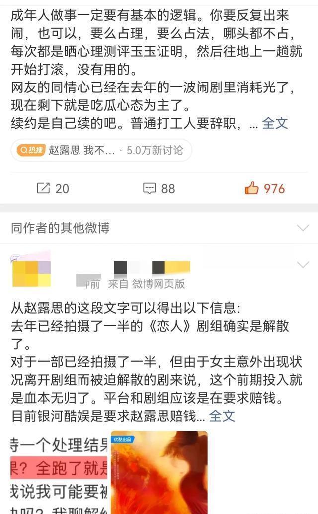 有业内的消息说这一举动是在跟经纪公司抗衡,因为该剧涉及优酷出品方,停拍将导致银河酷娱面临巨额连带赔偿。有消息称她以此要挟解约,试图绕过天价违约金。 近八个月的时间可以看出来,赵露思的诉求就是解约,但从她8月2日发布的微博来看,续约4年,这份合约大概要到2030年才到期,并伴有4亿的天价解约金。
